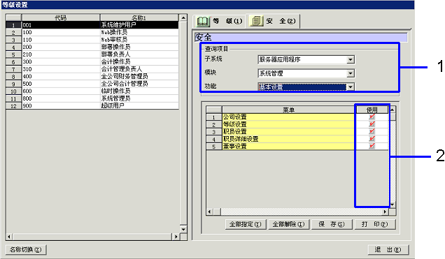 选择子系统、模块、功能,已选择的功能菜单被一览显示在画面上。选择赋予使用权限的菜单。