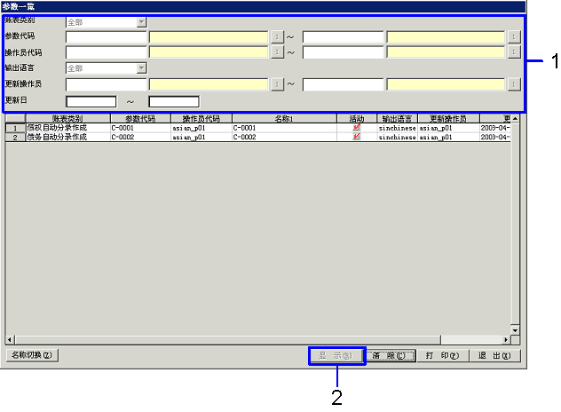 确认账表批处理输出及自动分录执行的设置状况一览。与[参数一览]及[账表参数一览]中设置状况的确认步骤基本相同。以下,以[账表参数一览]的确认为例进行说明。