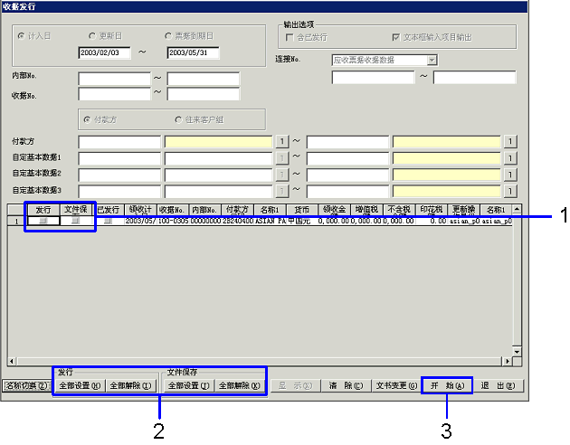 发行抽出的全部数据收据时,点击「发行」部分的“全部设置(H)”按键,将全部数据的发行复选框设为ON。