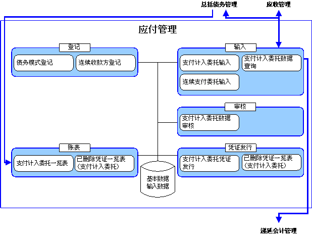 在[应付管理模块]中,可以进行支付计入委托的输入/审核以及账表输出。在此模块上输入的已审核支付计入委托数据,在[总括债务管理模块]上将作为债务数据来处理,进行冲销。