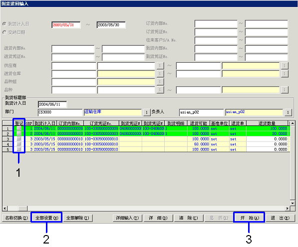 对到货商品,产品需退货时,在[到货退回输入]里输入信息。对处理完毕的到货凭证进行取消处理。在标题部输入订货No.,可以取消被表示的该到货数据。也可以在直接货运数据中进行。