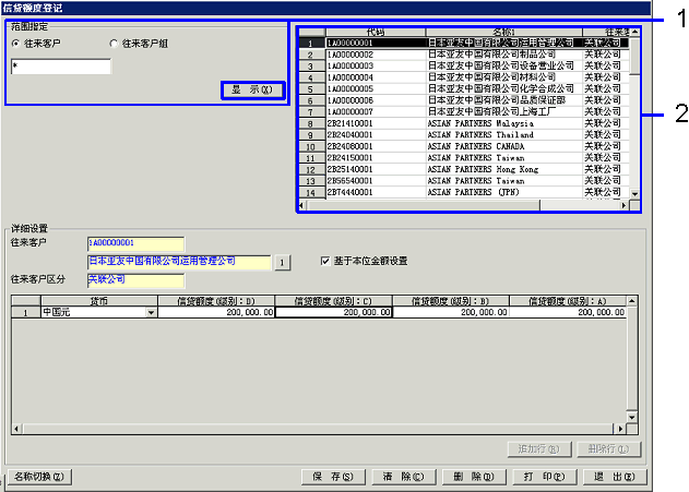 用在“货币”所指定的货币单位按不同等级输入信贷额度。从等级D到等级A,分别与[系统管理]的[等级设置]的从D到A的“信贷额度级别”相对应。因此,不同操作员都能够对往来客户设置信贷额度。
