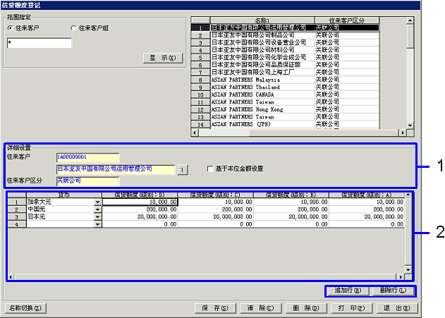 按照货币、等级的不同登记信贷额度。进行行的追加或删除时,点击“追加行”按键或“删除行”按键。