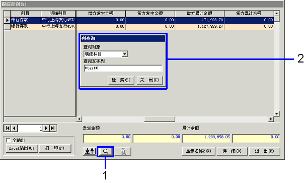 - 选择作为查询对象的列的标题后输入查询条件。也可以进行模糊查询。在此例中,缩小包含“三菱”的明细科目的范围并进行查询。