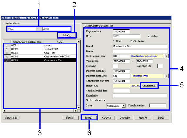 In [Register construction/commodity purchase code], register the code such as Construction code or Commodity purchase code used to manage the Construction in progress code by a breakdown of the Details. In [Spread] on the left side of the screen, registered Construction/Commodity purchase codes can be listed. With this list, you can select the Construction/Commodity purchase code to be set. To register a new code, click the "New" button.