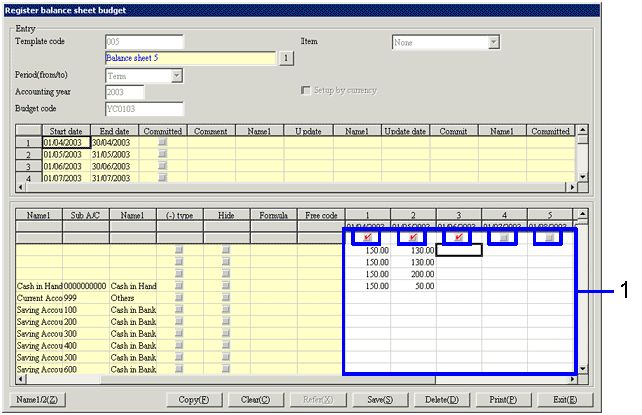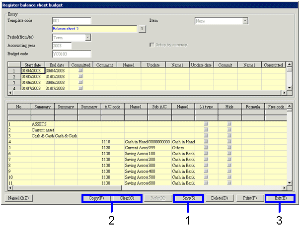 2. To enter another budget straight away, click the "Clear(C)" button, and go back to step 2 above, [Specifying the financial statements, period and other details used in registering the budget].