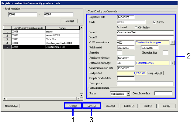 In [Register construction/commodity purchase code], register the code such as Construction code or Commodity purchase code used to manage the Construction in progress code by a breakdown of the Details. In [Spread] on the left side of the screen, registered Construction/Commodity purchase codes can be listed. With this list, you can select the Construction/Commodity purchase code to be set. To register a new code, click the "New" button.