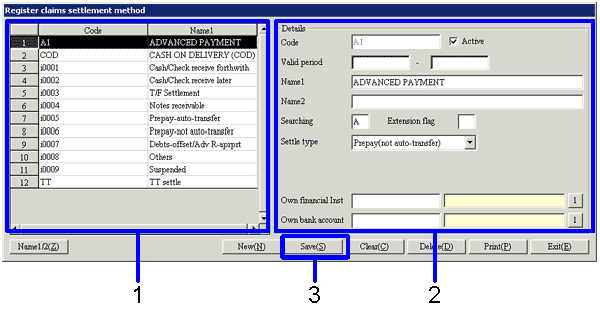 Register the claims settlement method (bank settlement, notes receivable, etc.). Also register the settlement account (current deposit, general deposit, etc.) to be initially displayed in the [Settle claims] auto-journal.