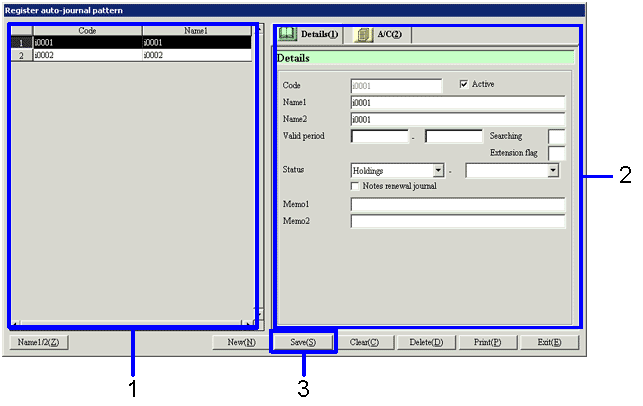 - Enter the jounal pattern code, name, and the status of the note in the [Details] of the [details] tabl