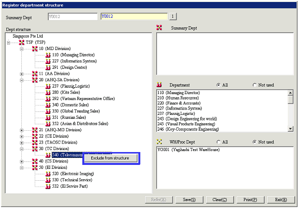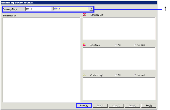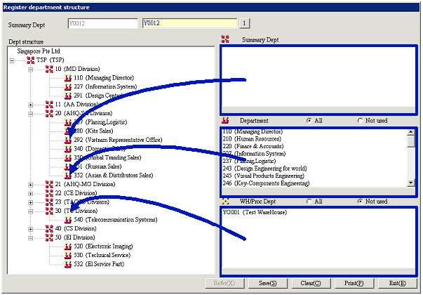 warehouse/process Depts for which structure is to be registered will be listed