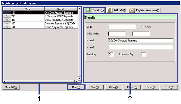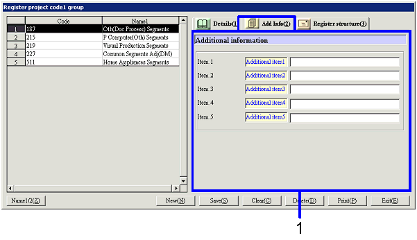 project code 2 group] screen – [Details] tab, [Additional
