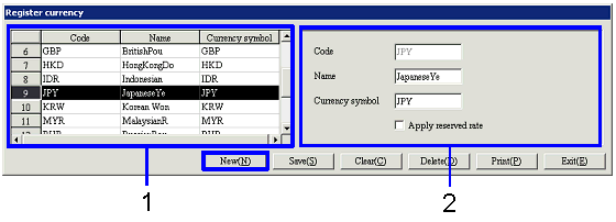 To register a new currency, click the "New" button.