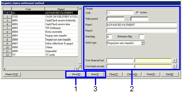 Register the claims settlement method (bank settlement, notes receivable, etc.). Also register the settlement account (current deposit, general deposit, etc.) to be initially displayed in the [Settle claims] auto-journal.