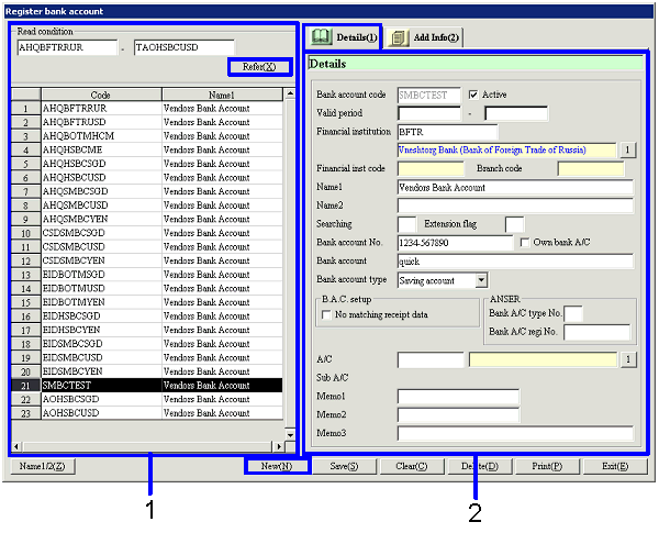 Select conditions to read the bank accounts to register or refer to.