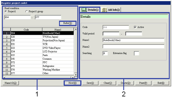 For example, using custom codes for summary is useful for cases involving more than one department such as sales promotion campaign expense.  Budget for each project can also be registered in budget registration of [Planning control module].  [Register project code 1] and [Register project code 2] have no difference in the functions, purposes of use and operation.  Use [Register project code 2] to register more than one project code.