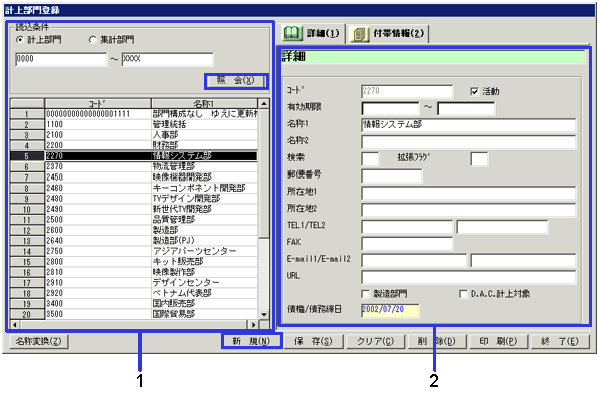 "照会"ボタンをクリックすると、読込条件にあてはまる計上部門が一覧表示されます。設定を行う計上部門を選択してください。選択した計上部門の情報が詳細タブに表示されます。
